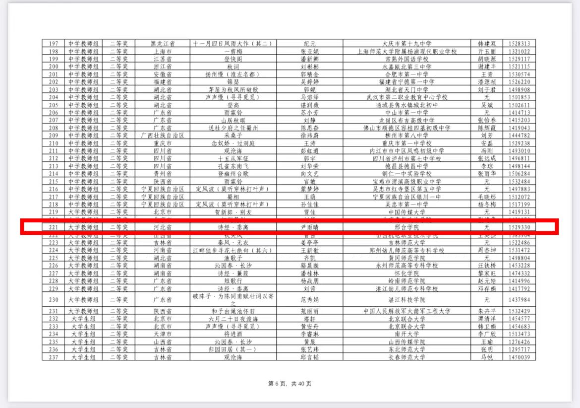 赛场上,来自复旦大学、中国传媒大学、新疆师范大学等高校的教师们同台竞技,纷纷展示出各自在高等教育中融入诗词素养的实践成果。此次比赛不仅检验了高校教师的诗词教学能力,同时也是对高校教师文学、历史、哲学、艺术等多学科融合能力的考验。在教务处和文学院的共同支持下,尹老师的作品《诗经·黍离》得以在激烈的竞争中脱颖而出,以独特的视角创新古典诗词的阐释方式和文化内涵,展示出我校教师深厚的传统文化底蕴和卓越的教学风采。