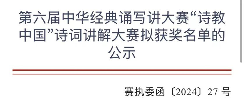 近日,根据《教育部办公厅关于举办第六届中华经典诵写讲大赛的通知》(教语用厅函〔2024〕2号)要求,第六届中华经典诵写讲大赛“诗教中国”诗词讲解大赛总决赛落下帷幕。文学院尹雨晴老师在全国总决赛中荣获二等奖。