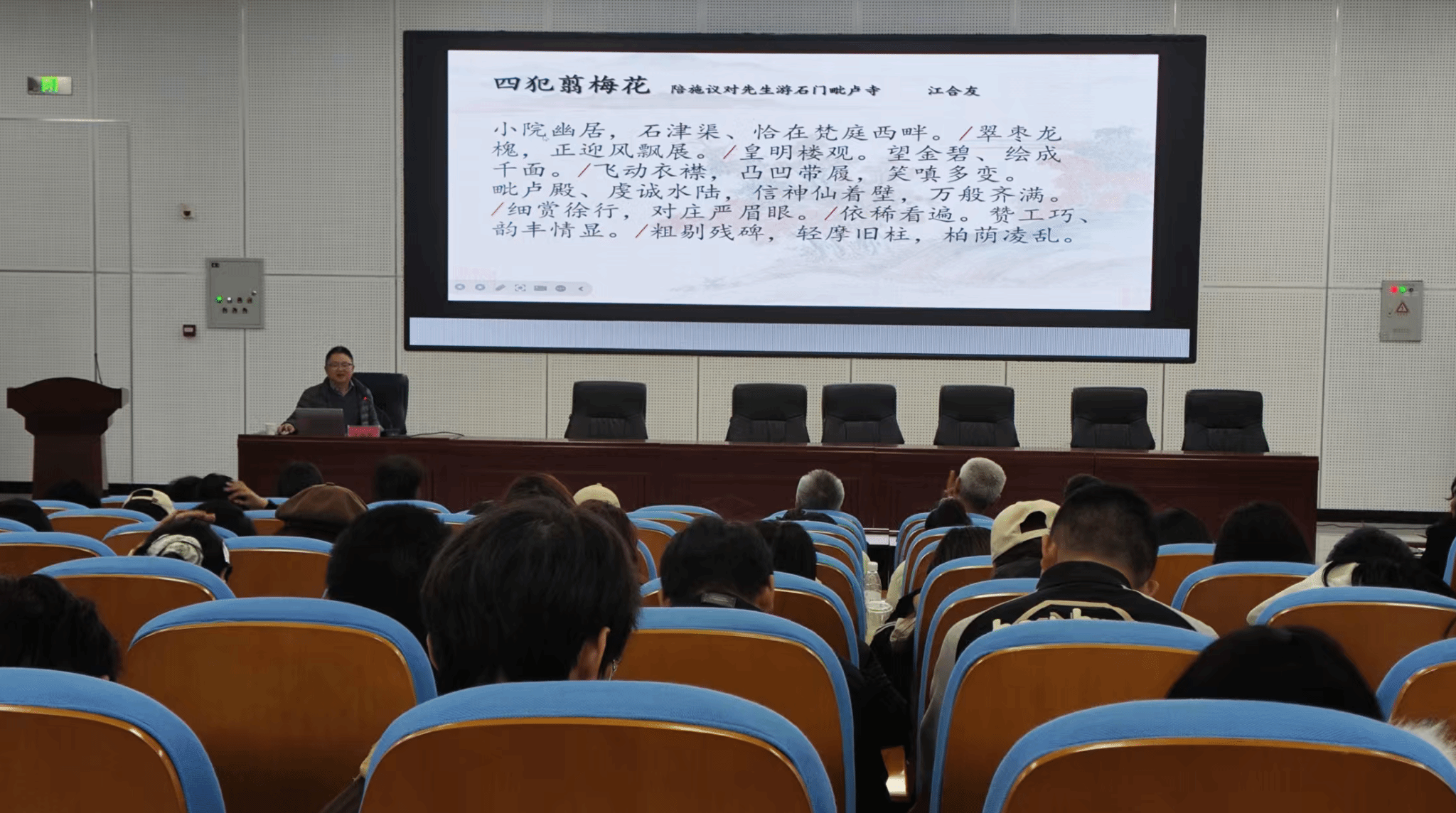 互动环节,江教授针对 “现代意象与传统融合”“格律与情感冲突” 等问题一一解答,并寄语与会师生“诗词会给你心灵净土,让你诗意栖居。”此次讲座不仅为汉语言文学专业师生明晰了旧体诗词创作路径,点燃了创作热情,更激发了学院教师在古典文学教学中的灵感与创新,为进一步提升人才质量奠定基础。