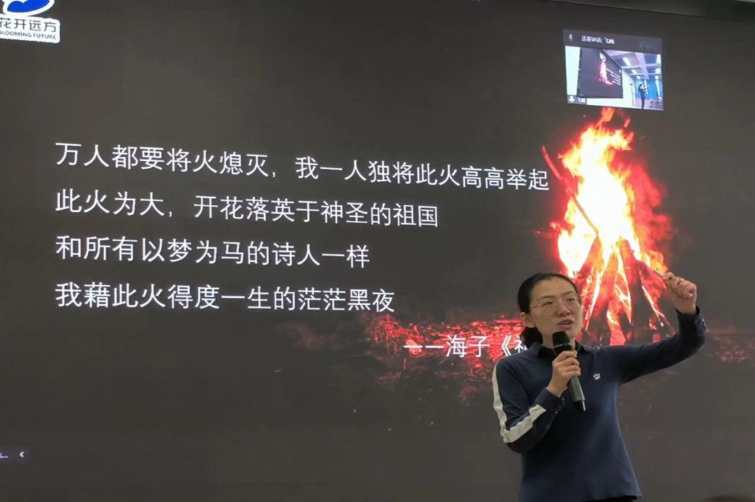 最后,张老师现场讲授《江城子·记梦》课程为学生展示教学技能和教育情怀。从作者苏轼颠沛流离又豪情万丈的一生,到他与妻子王弗十一年相伴相知,再到令人肝肠寸断的悼念诗“十年生死两茫茫,不思量,自难忘”。张老师以纯熟的教学技能和强烈的教育热情演绎了一节生动的中学课程。在讲课过程中与同学们互动频繁,诙谐幽默的语言常常引发大家开怀大笑,声情并茂的诗词讲解又令人潸然泪下。张老师饱满的教育情怀引领大家全情投入课堂,时不时还用温声细语的小妙招提醒大家注意听讲、留下笔记。张老师在课堂上展现出的饱含激情的抑扬顿挫、亲切自然的师生互动、大方得体的仪态表情让现场同学领悟到一名教育工作者所应该具备的教学技能和教育情怀。