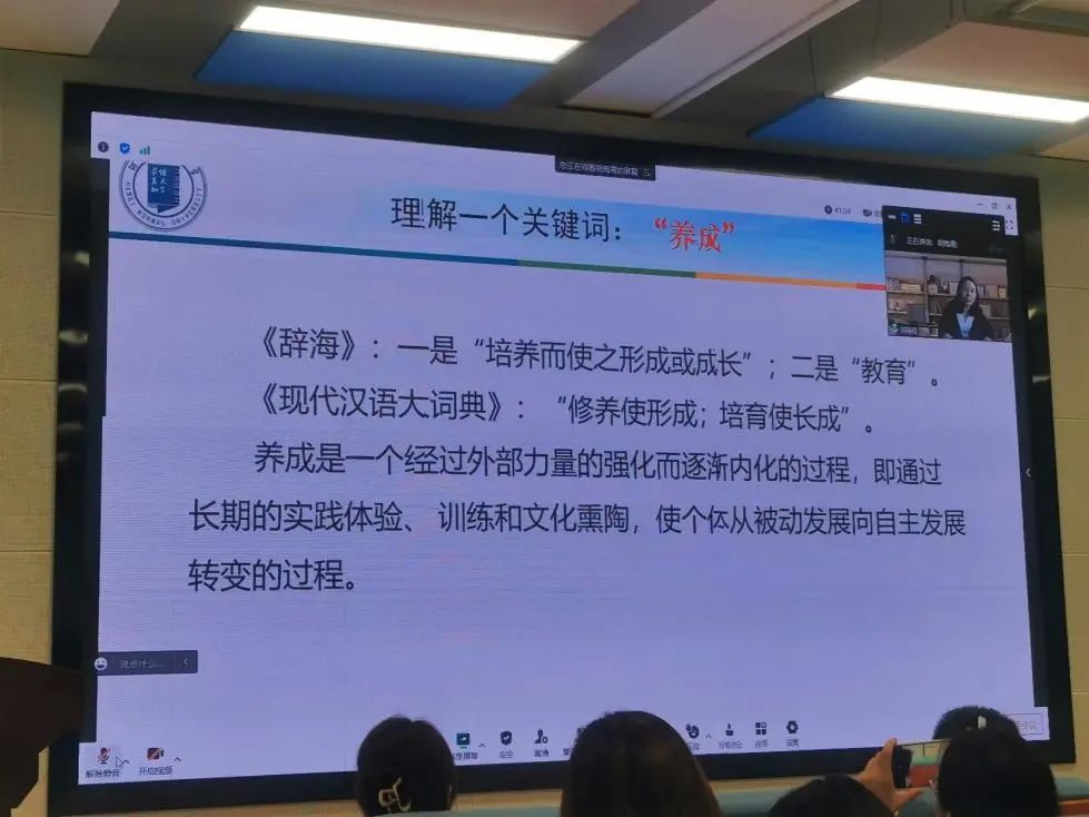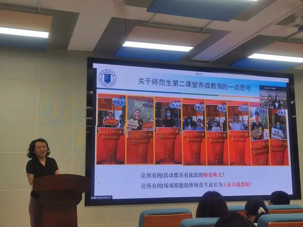 为推进以“新师范学社”等社团为牵引的第一、二课堂贯通工作,6月2日在一号教学楼一层阶梯教室,文学院邀请河北师范大学教师教育学院副书记、副院长胡海霞作题为《关于师范生第二课堂养成教育的一些思考》的讲座,讲座以线上视频方式进行,由文学院党委副书记李伟主持,21及22年新入职辅导员老师、新师范学社成员、22级全体汉本同学以及其他年级部分同学共200多名师生参加了此次专题讲座。以此次讲座为开端,文学院新师范学社工作正式拉开序幕。