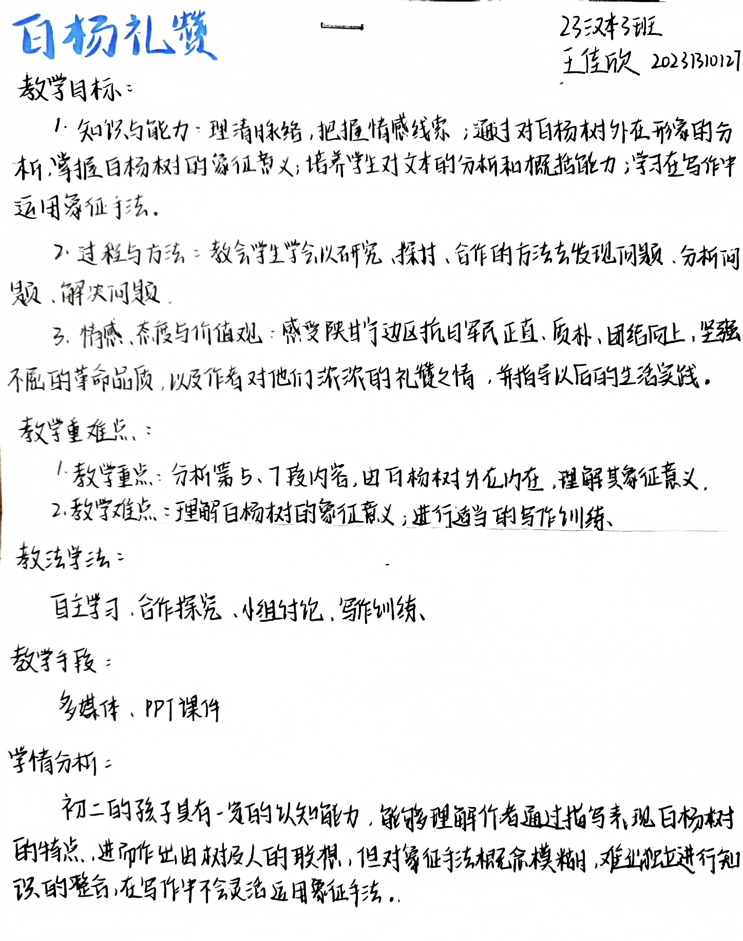 在活动过程中,同学们围绕指定的教学主题,结合个人兴趣与专业特长,精心策划、巧妙构思,创作出一系列内容丰富、形式新颖、书写精美的教案作品。这些教案作品的教学内容丰富且有深度,紧扣教学目标,涵盖重难点,知识体系完整。教学流程清晰顺畅,环环相扣,过渡自然。教学方法灵活多样,巧妙运用角色扮演、小组讨论等方法激发学生的兴趣,充分体现以学生为中心,引导学生深入思考与实践,极具创新性与实效性。