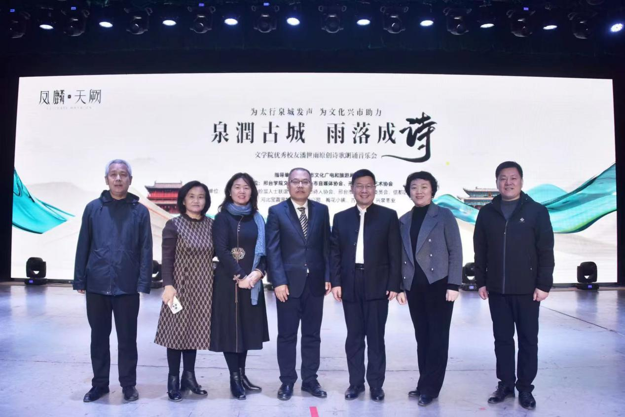 诗颂太行泉城,礼赞千年邢州。12月22日下午,由邢台学院文学院联合邢台市文化广电和旅游局、邢台市自媒体协会、邢台市朗诵艺术协会共同主办的邢台市首场歌颂“太行泉城”的原创诗歌朗诵会,“泉润古城 雨落成诗——文学院优秀校友潘世雨原创诗歌朗诵音乐会”在邢台学院音乐厅隆重举行。此次朗诵会得到了邢台市新的社会阶层人士联谊会、邢台市诗人协会、邢台市侨联青年委员会、信都区欧美同学会等单位协办支持。邢台学院党委书记贾云霄,邢台市政协副主席韩明智,邢台学院副校长刘永利,邢台学院副校长张盈利,邢台学院文学院院长范爱菊,邢台学院文学院副书记李伟,邢台市委副秘书长文青峰,邢台市委统战部副部长史海龙,邢台市委宣传部部务会成员、市文明办副主任许阳等领导,邢台学院文学院历届优秀校友,与邢台学院文学院师生及广大诗歌朗诵爱好者共400余人参加朗诵会。活动同步线上直播,截止活动结束浏览量已经超过12万。