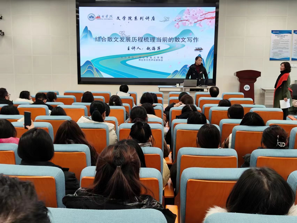 讲座中,赵海萍老师首先回顾了中国散文的发展历程,从古代的《尚书》《过秦论》《水经注》《小石潭记》《岳阳楼记》等经典作品到现代散文大家鲁迅、郁达夫、吴伯萧、师陀,再到当代散文名家周晓枫、塞壬(原名黄红艳)等人的作品,让我院教师和学生们更加全面地了解散文的发展历程和当前散文写作的现状。