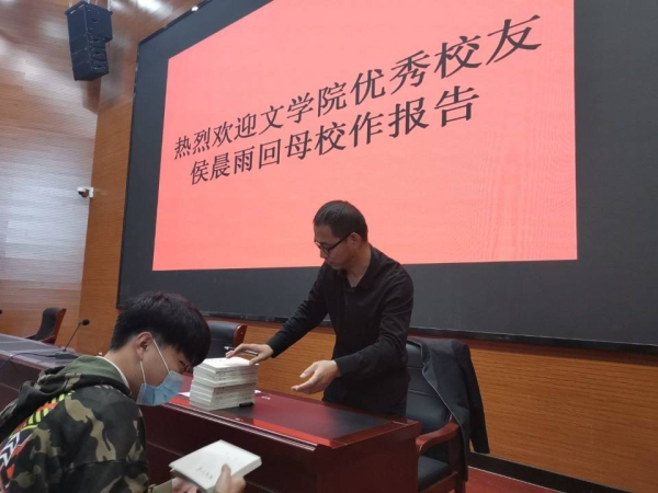 报告结束后,侯晨雨老师向师弟师妹们赠送了他的第一本散文集《逆风飞翔》,并在书上留下“阅读使人广博,写作使人深刻”的寄语。