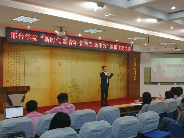 为纪念五四爱国运动100周年,传承五四精神,激发新时代大学生使命担当,5月20日晚7点,由校团委举主办、文学院团委承办的“新时代 新青年 新担当 新作为”主题演讲比赛决赛在图书馆报告厅举行。校团委学生处处长张盈利、文学院党委书记施江斌到场观看了比赛。文学院副院长张兰英、校团委学生处张胜林、校工会史秀娟、文学院副教授张玉棉、学管办主任李伟担任评委。