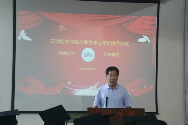 学校党委常委徐惠敏、招生就业处处长王自力、文学院分学位委员会主席王玉华、汉语言文学教研室主任于宏源、秘书学教研室主任孟宪华、戏剧影视文学研室主任任慧群为文学院本科毕业生颁发学士学位证书并履行相关仪式。