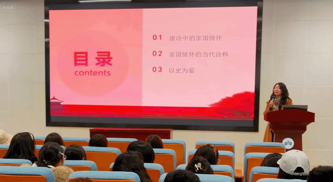 讲座以 “唐诗为何能成为家国情怀的千古绝唱” 开篇,范爱菊将盛唐气象与时代精神相连,精选李白、杜甫、王昌龄等诗人的经典诗作,从 “黄沙百战穿金甲,不破楼兰终不还” 的戍边壮志,到 “安得广厦千万间,大庇天下寒士俱欢颜” 的民生悲悯,从 “天生我材必有用” 的自信昂扬,到 “先天下之忧而忧” 的家国胸襟,结合历史背景与当代语境,深度解读唐诗中具象化的故土眷恋、民生关切与民族担当。