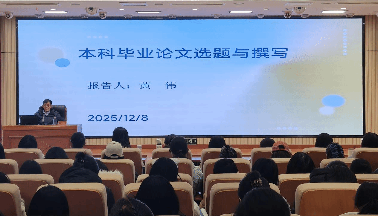为切实提升本科生毕业论文质量,助力师生准确把握论文选题方向、规范撰写流程,12月8日下午,南京师范大学黄伟教授受邀莅临我校,开展了一场以“本科毕业论文选题与撰写”为主题的讲座。讲座由文学院院长范爱菊主持,文学院、教育科学教学部师生现场聆听。